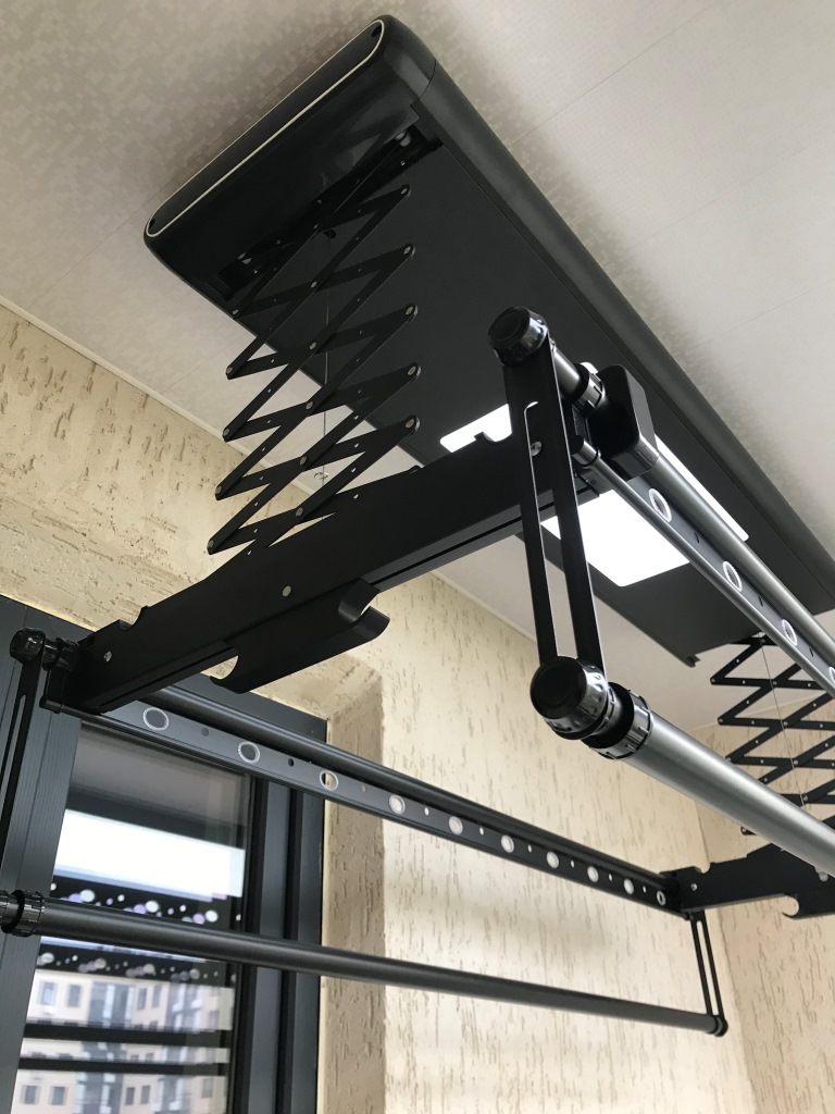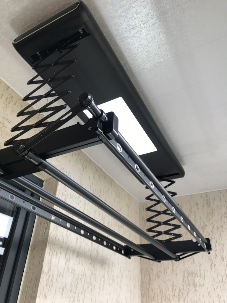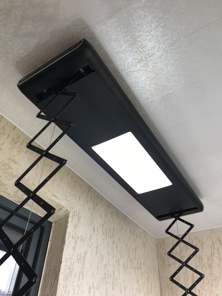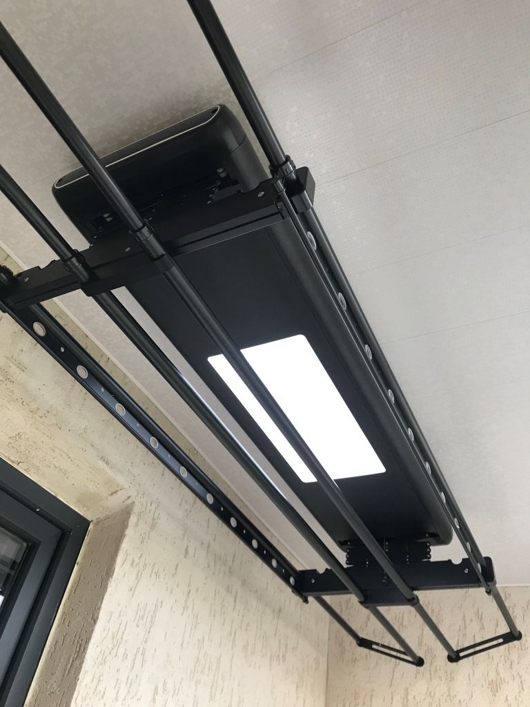 Потолочная сушилка для белья оснащена трубчатым двигателем (АC) и датчиками остановки на опускание системы для развешивания белья иперегрева двигателя.Четыре телескопических стержня изготовлены из алюминия и покрашены под цвет сушилки. Пульт дистанционного управления позволит опустить стержни на комфортное расстояние.Автоотключение: УФ З0 мин.,освещение,вентиляторы и обогрев 120 минут. Рекомендуе ознакомиться с видеоинструкцией по установке и монтажу сушилки.